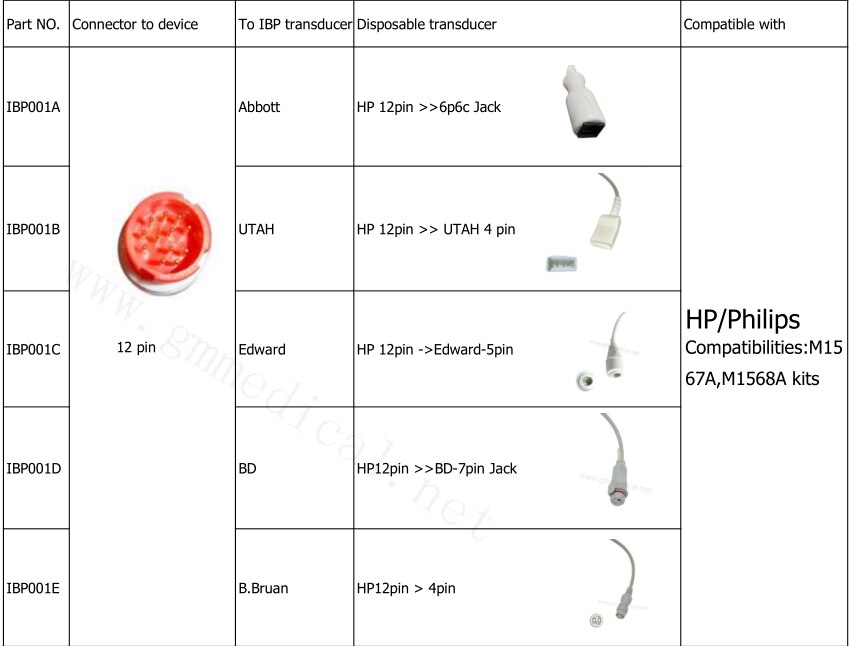 IBP001A:HP kompatibel -Appott IBP adapterkabel, 10ft, Hp12pin >>6p6c Jack IBP001B :HP kompatibel -UTAH IBP-adapterkabel, HP 12pin >> UTAH 4-pinners IBP001C:HP Kompatibel Edward IBP-adapterkabel, HP 12pin ->Utgående-5pinne IBP001D: HP kompatibel -BD IBP-adapterkabel, Hp12pin >>BD-7pin-jack IBP001E: HP Kompatibel -B.Bruan IBP Adapter kabel, Hp12pin > 4pin Kompatibilitet : M1567A, M1568A sett