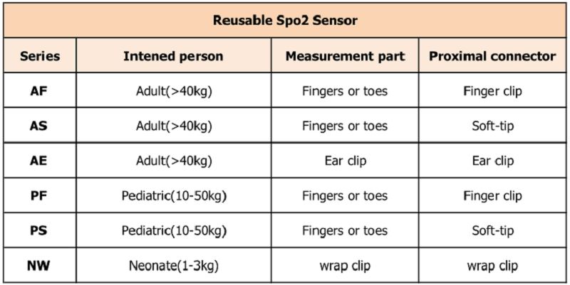 (AF&AS serie) Den storlagde gjenbrukbare spo2-sensoren er koblet til det kompatible pulsoksymeteret for kontinuerlig ikke-invasiv overvåking av funksjonell oksygenmetning av arteriell hemoglobin (SpO2) og pulsfrekvens (PR) for voksne pasienter som veier mer enn 40 kg.