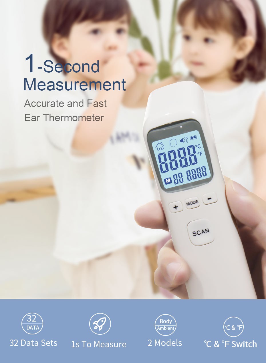 Ikke-kontakt design Det vil være mer sanitær, potensielt redusere spredningen av bakterier eller infeksjoner. Hold sensoren mellom 3 - 5 cm fra huden, så får du en god lesning Nøyaktig lesing Vedta avansert teknologi, sørg for at termometeret uten kontakt gir konsistente målinger med nøyaktighet på +/- 0.2 Deg.C raskt og enkelt Det er i stand til å vise deg en avlesning i løpet av 1 sekund, noe som er en stor utfordring for vanlig termisk termometer. Celsius og Fahrenheit kan enkelt og øyeblikkelig byttes med LCD-skjermen og Fever Alarm White bakgrunnsbelysning gir en fin glød for enkel lesing om natten eller mørke situasjoner. Og det vil gis pip hvis den målte kroppstemperaturen er over feberalarmtemperaturen, kan du justere feberalarmtemperaturen i MODE Flere operasjoner Ingen grunn til å skrive ned den sist registrerte temperaturen under en feber, dette termometeret har innebygd minne som kan registrere opptil 32 målinger som er gjort når som helst